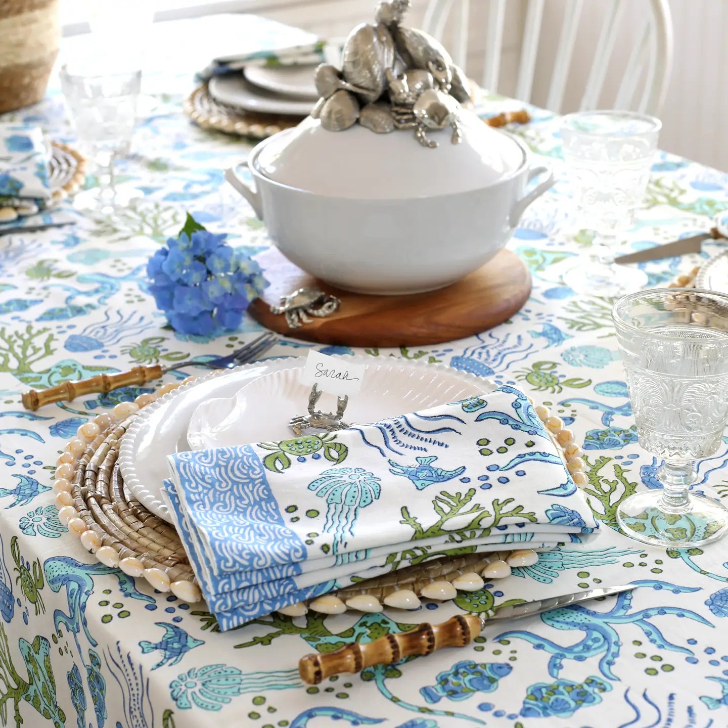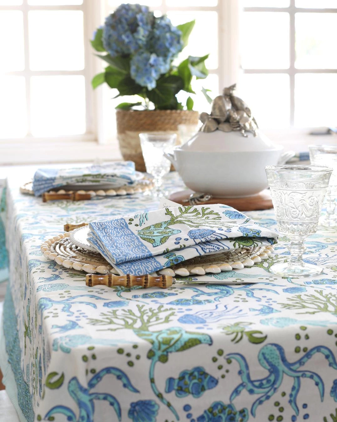 Create a unique table setting with our hand block-printed tablecloths in fresh, updated riffs on classic Indian designs. Printed in blue, seafoam and green, this fun print is brimming with creatures from the sea. 8 Coordinating Dinner Napkins are included.