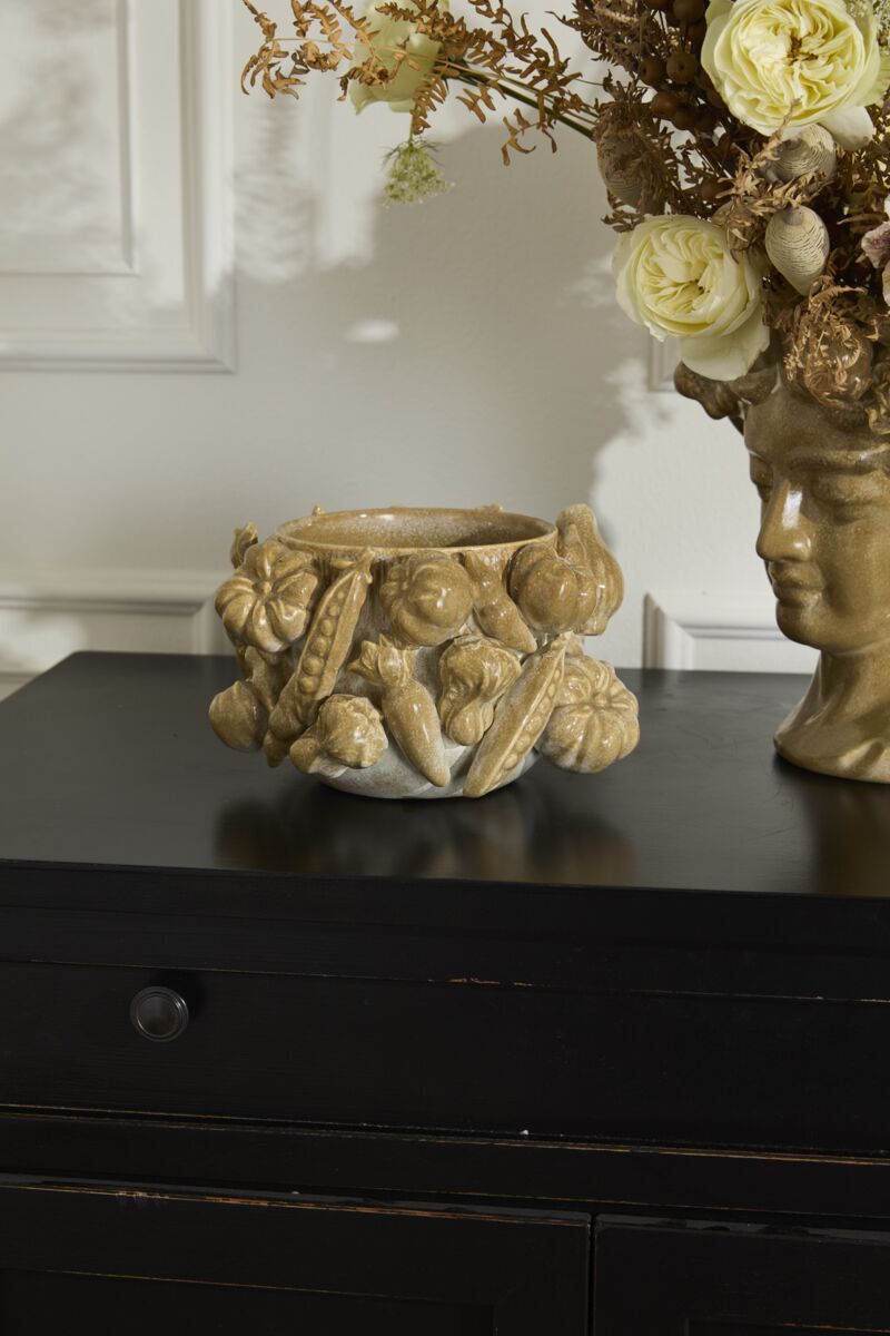 Celebrate the harvest season with the Lady Harvest Pot, adorned with an array of veggies including corn, peppers, peas, & more, creating a bountiful, nature-inspired design. Each piece features unique variations in placement of veggies & finish, thanks to the light tan reactive glaze that enhances the details. This perfectly fits a 5.5-inch drop in plant, bringing the warmth and abundance of the harvest season.