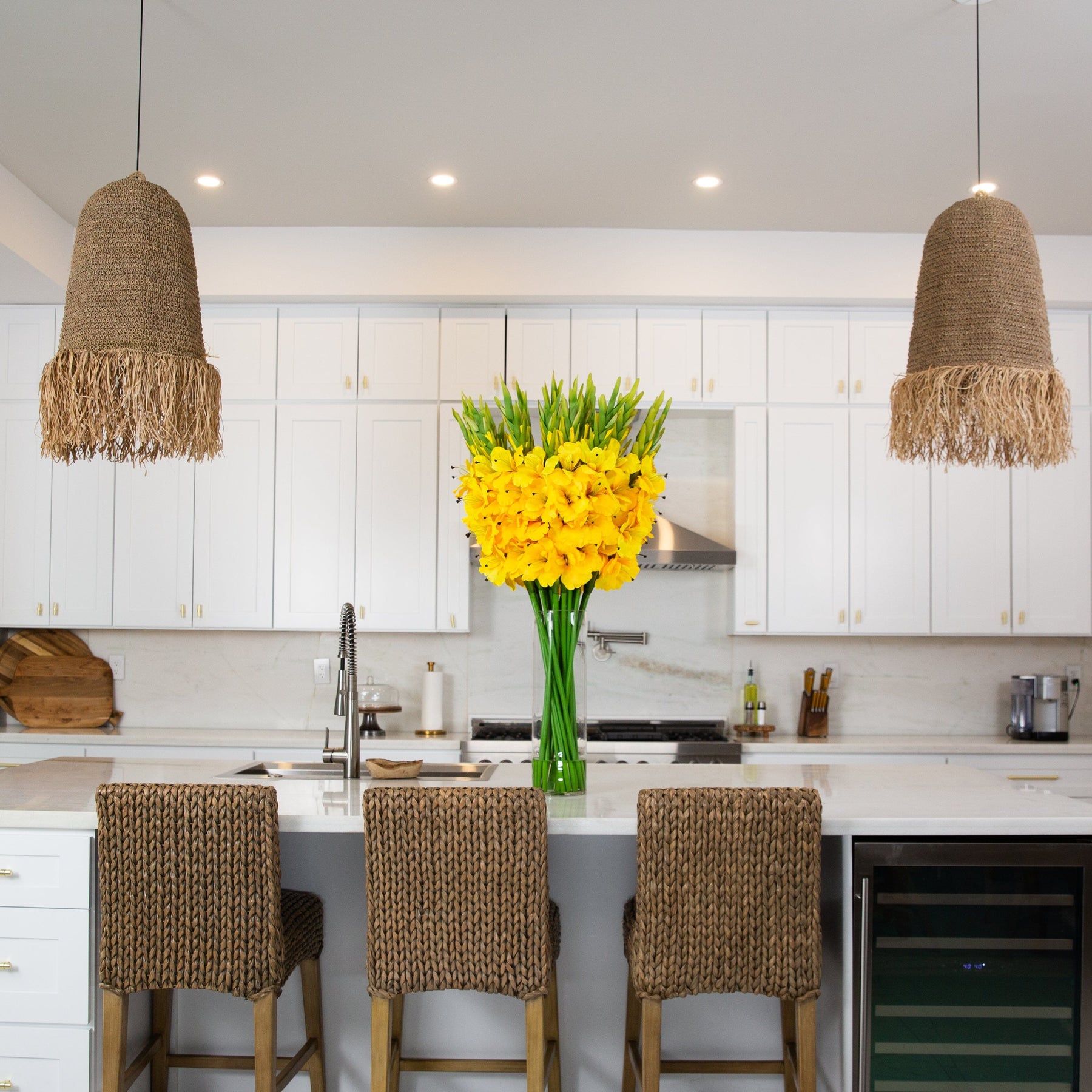 Certain pieces exude an aura of magnificence wherever they're placed. Meet the Gladiola arrangement, a jewel in our Signature Collection — the epitome of craftsmanship and luxury. Influenced by the vibrant elegance of grand hotel displays and handcrafted by seasoned horticulturists from top-tier materials, it promises to liven your space with a medley of vivid hues. Shape its branches to create a statement piece that perfectly suits your aesthetics. Nestled in a clear glass vase and soaring to an impressive 44", the arrangement is complemented by a special, proprietary fade-resistant water, Liquid Illusions. A guaranteed head-turner, it's the ideal centerpiece for any area in need of an eye-catching focal point. Add to a coffee table, kitchen island, or a business setting.