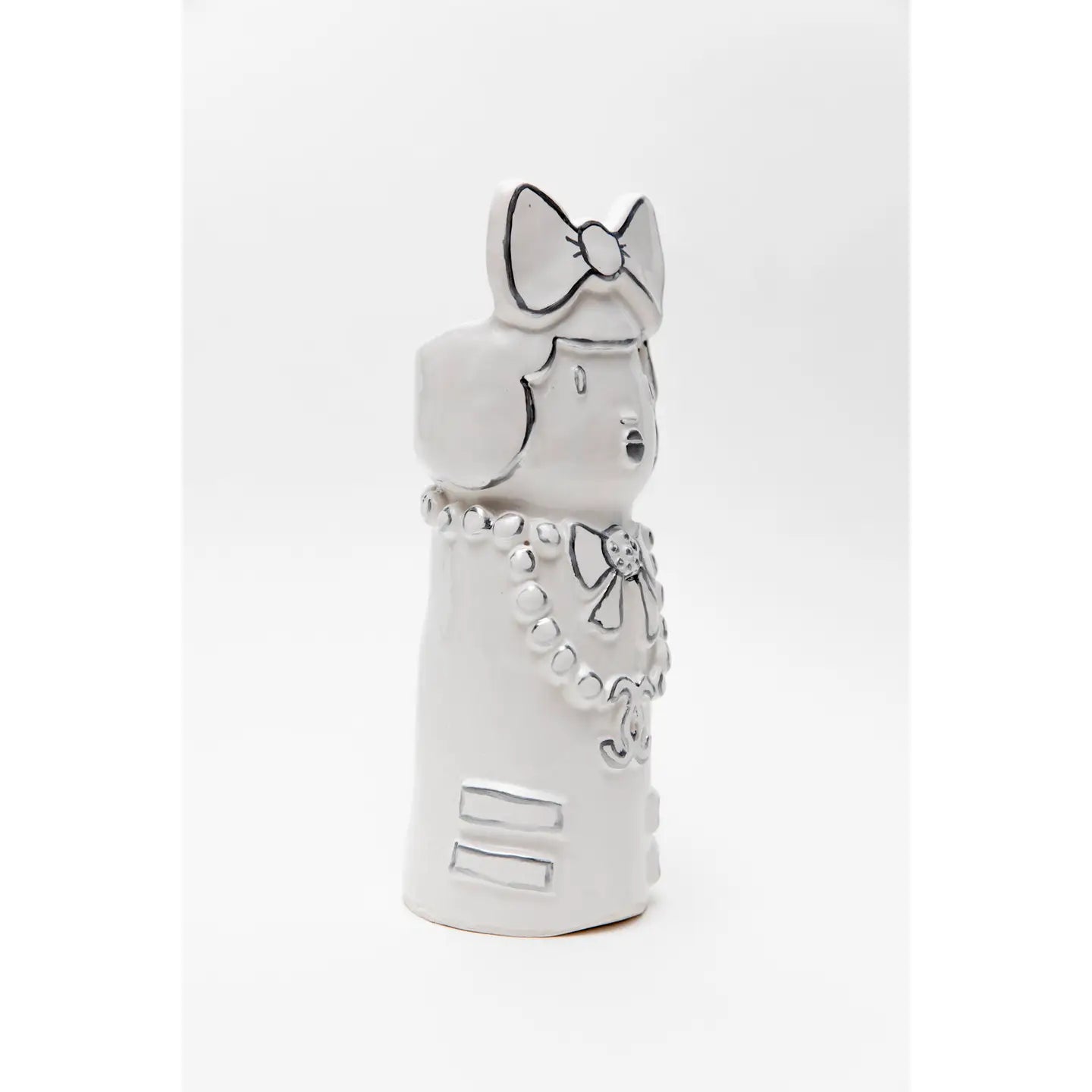 The Coco Vase is a flower vase hand-sculpted out of ceramic clay. Glazed bright white with shiny metallic chrome details. It showcases its charming, characterful profile perfectly.