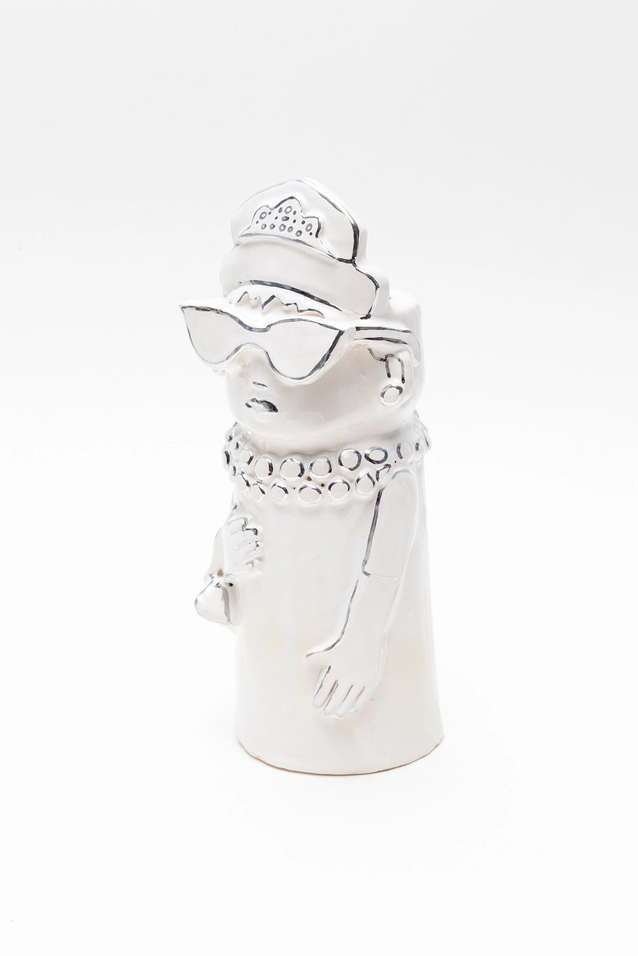 The Audrey Vase is a flower vase hand-sculpted out of ceramic clay. Glazed bright white with shiny metallic chrome details. It showcases its charming, characterful profile perfectly.